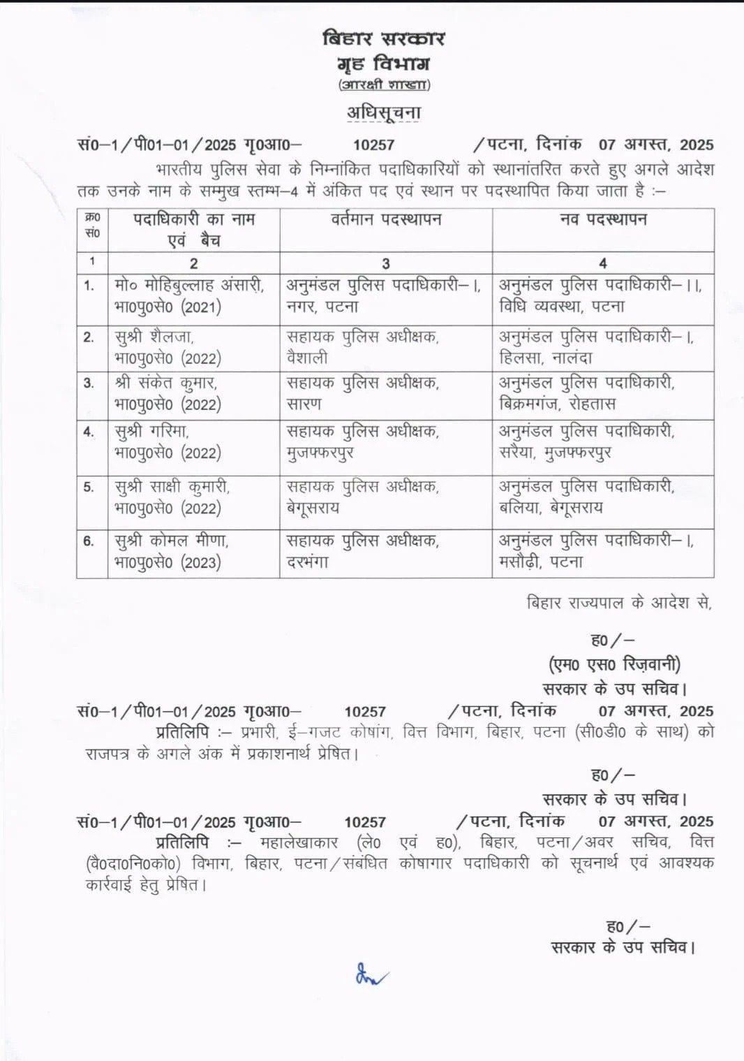 गृह विभाग की ओर से जारी अधिसूचना के अनुसार इस बार कुल छह IPS अधिकारियों को इधर से उधर किया गया है। इन अधिकारियों की नियुक्ति सहायक एएसपी के पद पर की गई है।