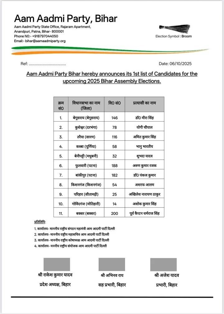 पटना, एजेंसियां। बिहार में आम आदमी पार्टी में प्रत्याशियों की घोषणा के मामले में बाजी मार ली है। पार्टी ने बिहार विधानसभा चुनाव 2025 के लिए अपने प्रत्याशियों की सूची जारी कर दी है। इसके तहत पहली सूची जारी करते हुए 11 सीटों पर प्रत्याशी उतारे गये हैं। AAP ने साफ किया है कि वह बिहार में “ईमानदार” और स्वच्छ छवि वाले उम्मीदवारों पर दांव लगाएगी।