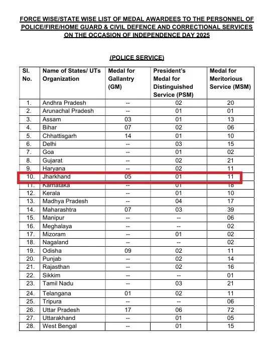 झारखंड पुलिस के इन जांबाज अधिकारियों और जवानों को यह सम्मान उनकी कर्मठता, बहादुरी और सेवा भावना के लिए दिया जा रहा है। स्वतंत्रता दिवस के दिन इन सभी को औपचारिक रूप से सम्मानित किया जाएगा।