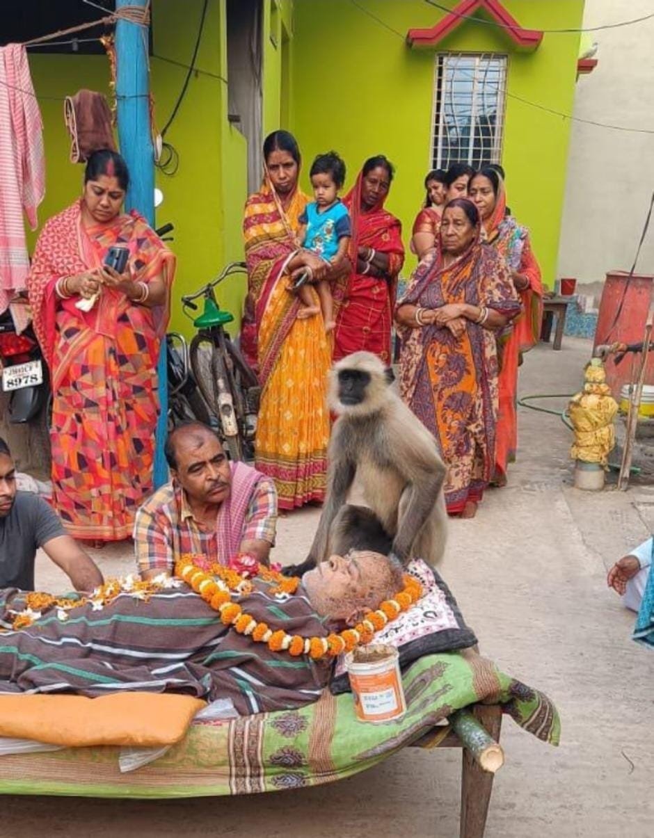 चाकुलिया प्रखंड के कालापाथर गांव निवासी 80 वर्षीय गौरांग चन्द्र पाल का निधन बीते सोमवार को हो गया। उनके अंतिम संस्कार के पूर्व उनका शव अंतिम दर्शन के लिए घर के आंगन में चारपाई कर रखा गया था। लोग उनके अंतिम दर्शन कर उनके पार्थिव शरीर पर पुष्प अर्पित कर रहे थे। इसी बीच कहीं से एक लंगूर आ पहुंचा। वह चारपाई पर स्व. पाल के सिरहाने बैठकर उनका सिर और चेहरा सहलाने लगा। उसने गौरांग चन्द्र पाल के पार्थिव शरीर पर अन्य लोगों की तरह पुष्प अर्पित किया।