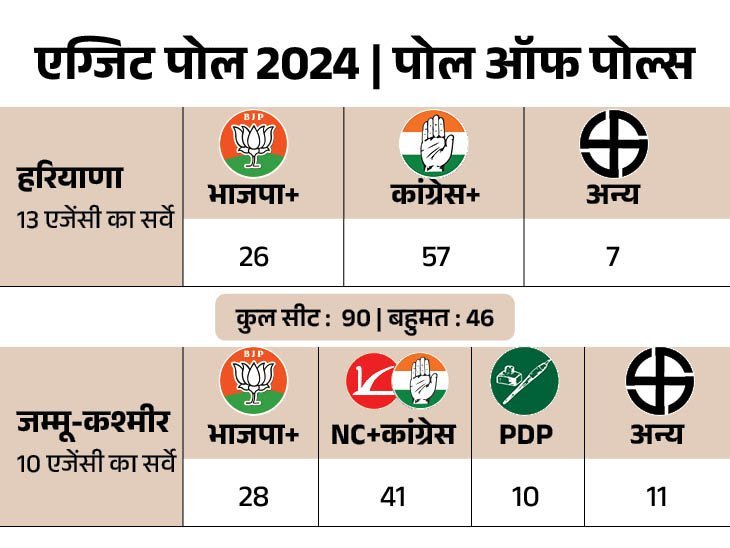 हरियाणा में 12 सर्वे एजेंसियों ने एग्जिट पोल किए। जम्मू-कश्मीर में भी 10 एजेंसियों ने एग्जिट पोल किया। इन सबको मिलाकर पोल ऑफ पोल्स का हिसाब लगाया गया।